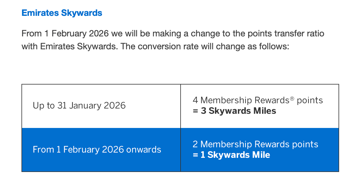 From 1st February 2026, the transfer rate will drop from the current 4:3 ratio (four Membership Rewards points for three Skywards miles) to a painful 2:1 ratio (two points for just one mile). That's a 33% reduction from where we are today, and a whopping 50% devaluation from the original 1:1 rate we enjoyed until August 2024.