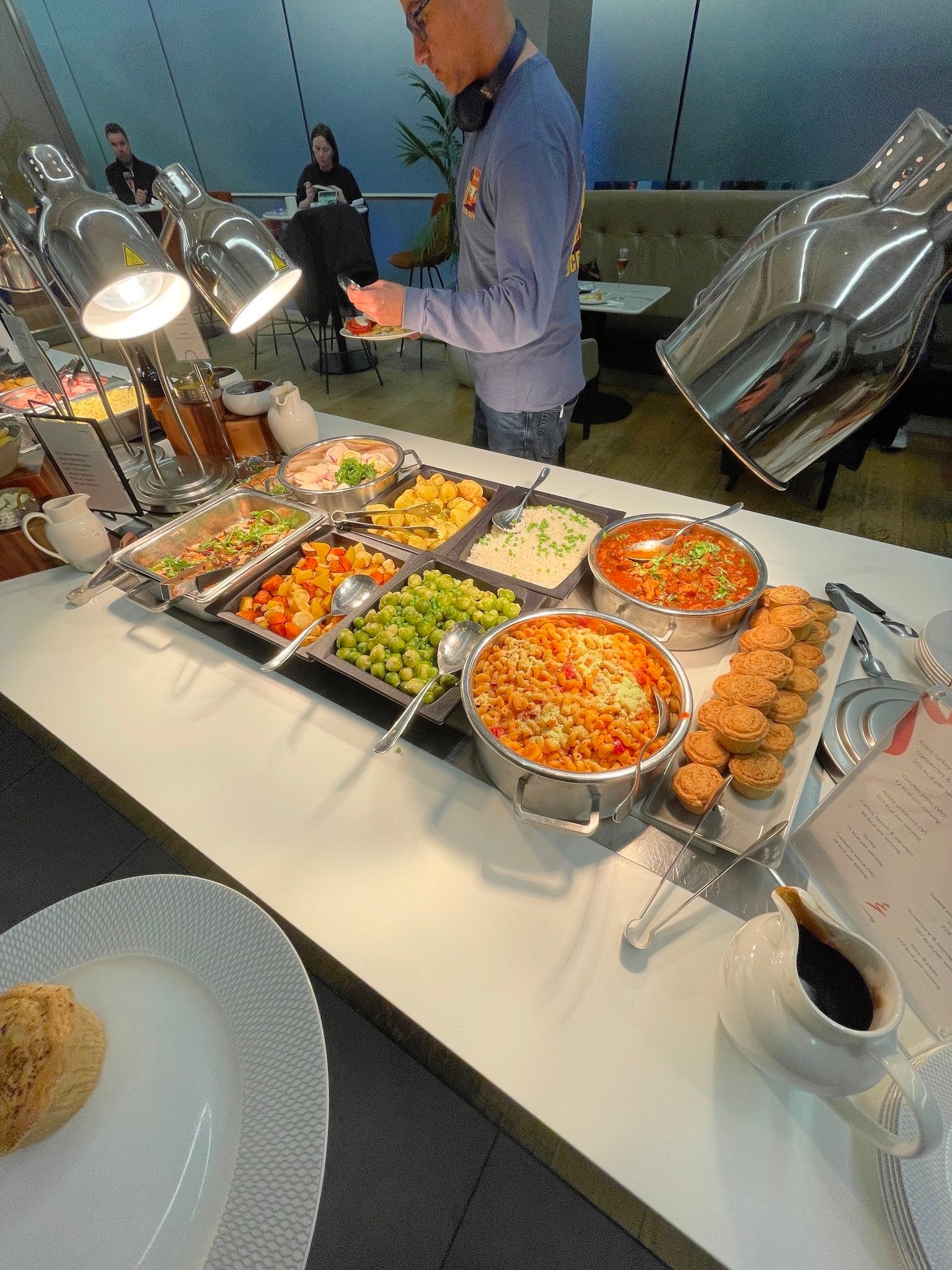 The food offering is respectable. There's a buffet setup with hot and cold options – when I visited, this included scrambled eggs, sausages, smoked salmon, various pastries, and a selection of salads and cold cuts. Everything was perfectly edible. The scrambled eggs were fluffy enough, the salmon was decent quality, and the pastries were fresh. But nothing made me think "wow, this is exceptional." It's good food – the kind you'd be happy with – but it doesn't blow you away.