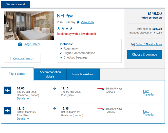 However, with 4,039 Avios, I could get £35 off the £149 Pisa holiday above, meaning I could spend two nights in Pisa and a return flight from Heathrow, including bags, for £119.