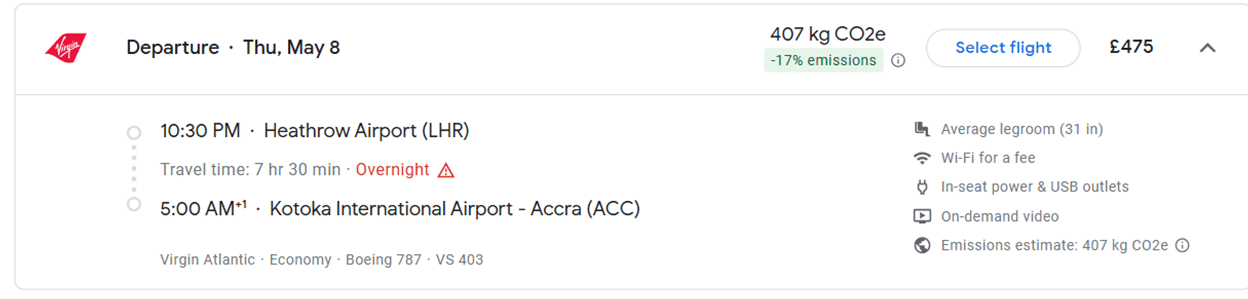 The Smart Redemptions Extension shows most economy flights to Ghana being sold for £475 one way: